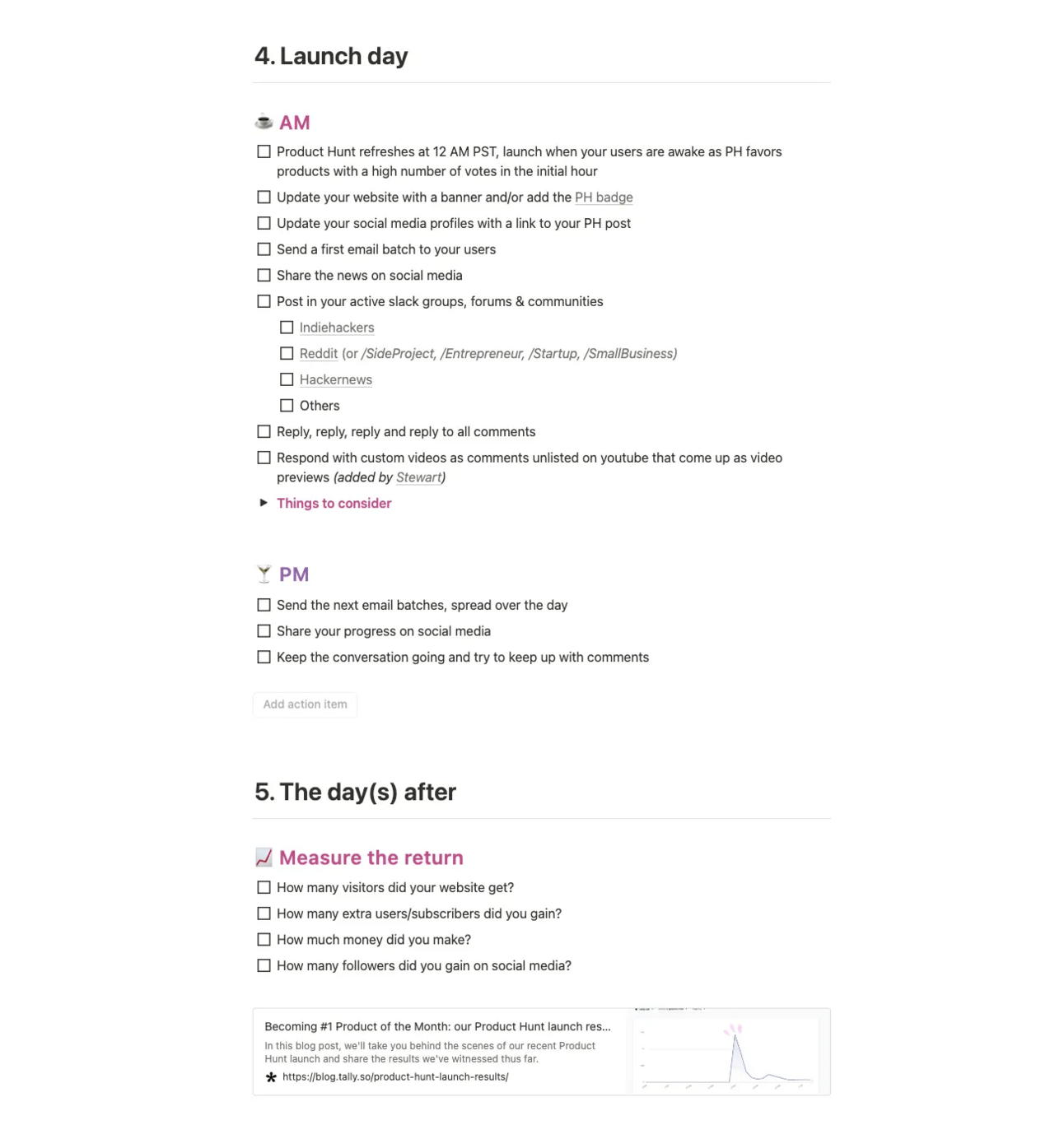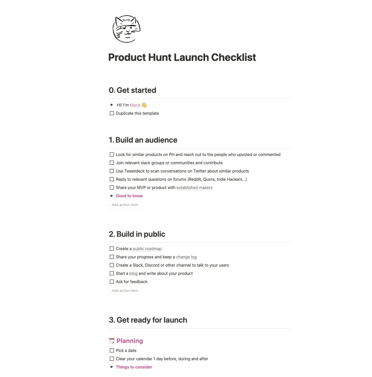 They created their product hunt launch checklist using notion, and they shared it through notion site, you can get the full checklist it here.