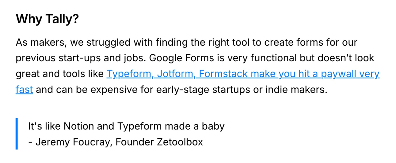 Tally is a notion-liked no code form builder. You can create forms just like writing a doc in Tally. Behind tally.so is a bootstrapped project with two founders, which grows to over $2M ARR today.
