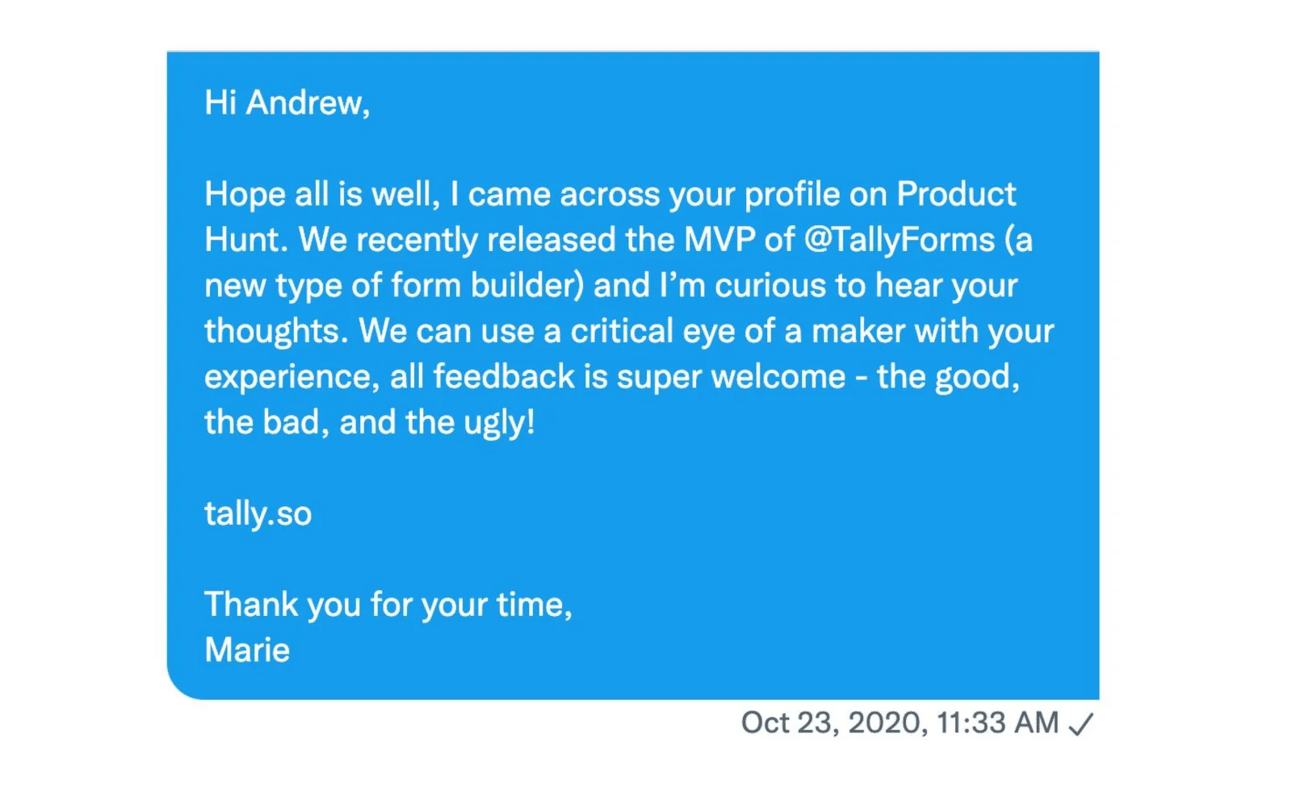 They launched their MVP in August 2020, shared it with their families and friends for an early test and refined the product based on their feedback. Tally was a very simple product, You can create unlimited numbers for forms and submissions even with a free version. it was very generous which brings words spreading.