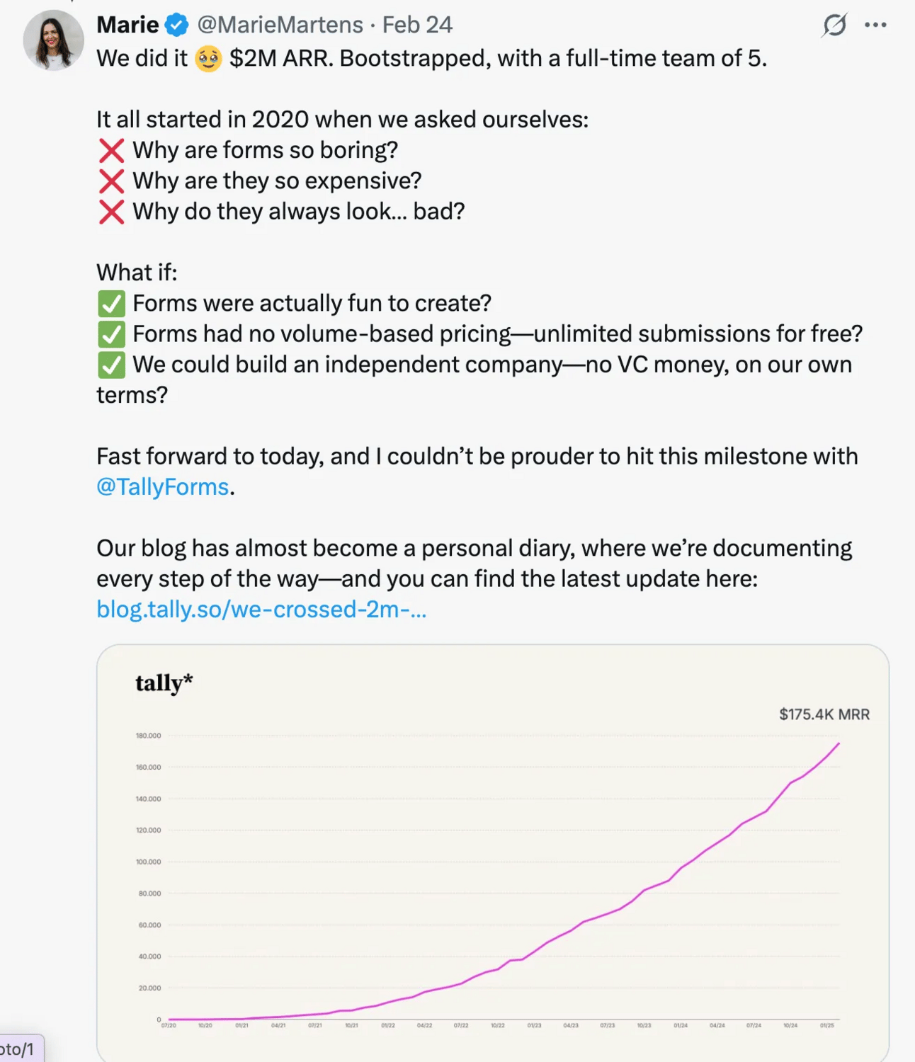 As of early 2025, Tally has surpassed $2 million in Annual Recurring Revenue (ARR) with a lean team of five, all while remaining self-funded and independent. And the story of tally is also a build in public story.