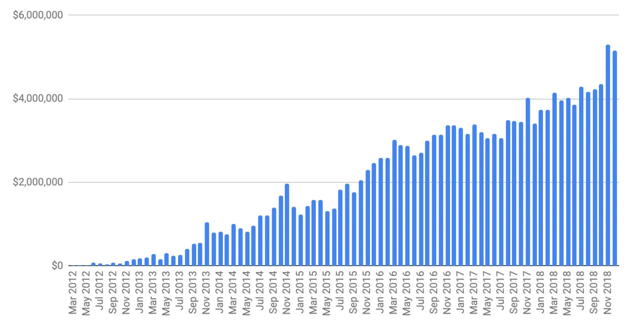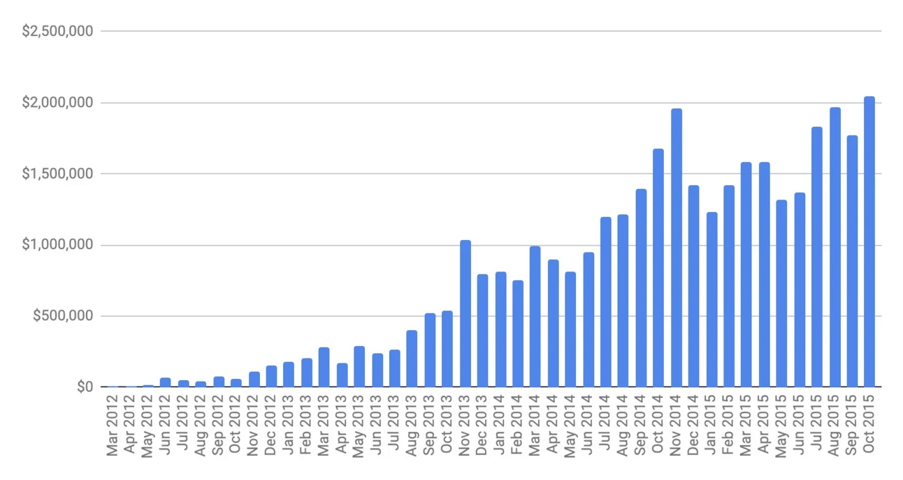 There were months where I worked 16 hours a day, but there were also some months where I worked four hours a week. Can you tell which is which? Can you telll when they fired the sales team? It doesn’t make much difference at all.