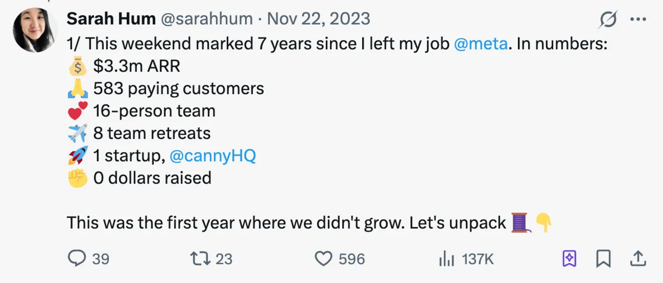 Canny was founded by Sarah Hum and Andrew Rasmussen back in 2015, when Sarah and Andrew decided to quit from Meta and become digital nomads. After 10 years later, Canny has grown into a product that generates more than 3.4 million ARR. And Canny is a fully bootstrapped company, no VC Funding. I’m gonna share all the details and secrets of How Canny.io grows into a successful bootstrapped SaaS company.
